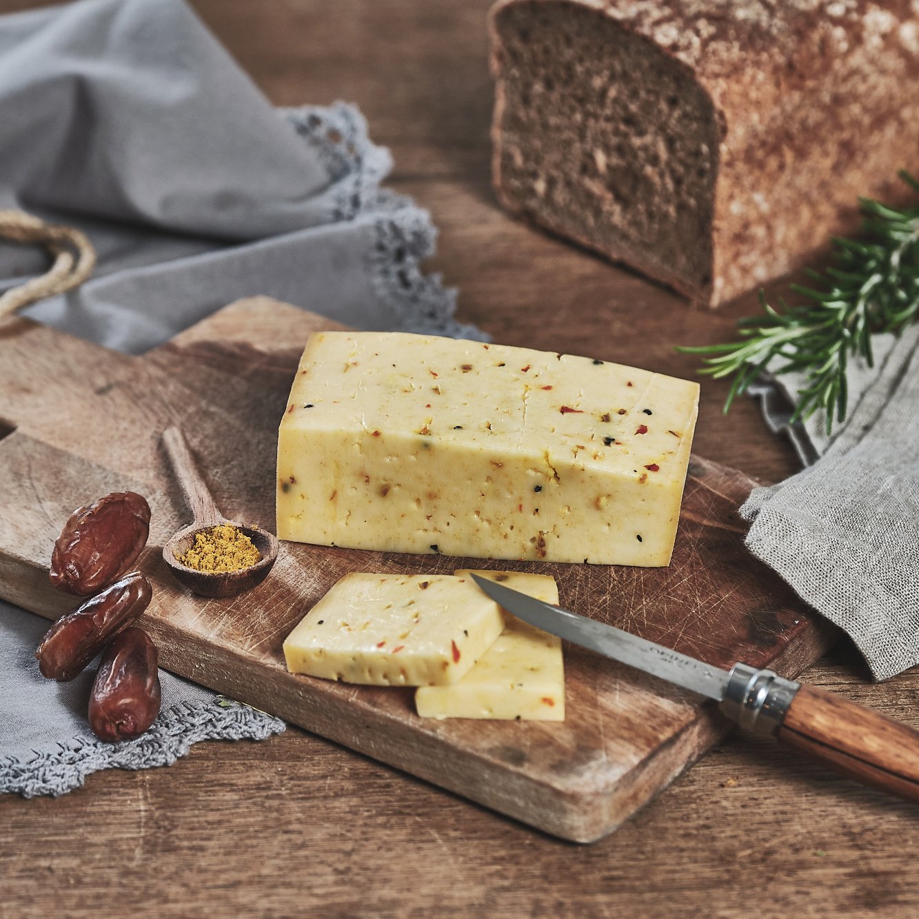 Bei dieser Käsesorte spiegelt sich die hohe Qualität unserer Rohmilch und die Fütterung unserer Kühe mit hofeigenem kräuterreichen Kleegras- und Wiesenheu im reinen frischen Geschmack wider. Dieser Schnittkäse wurde mit einer feinen Currynote und Datteln veredelt. Dannwischer Käsegenuß mit orientlischem Flair.