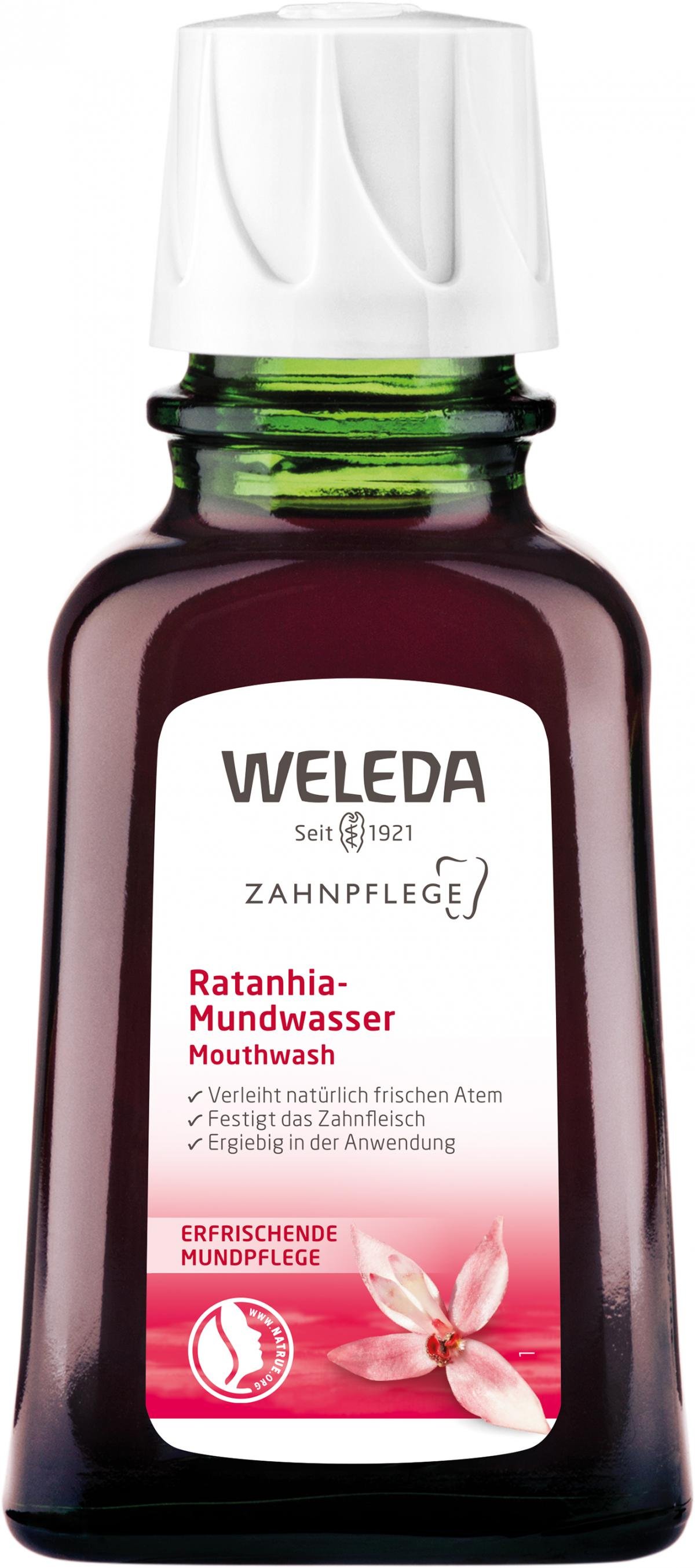 Das Weleda Ratanhia-Mundwasser regt durch ätherische Öle und mineralische Substanzen die natürlichen Funktionen der Mundschleimhaut sowie der Mundflora an und sorgt für frischen Atem ohne Geschmacksbeeinträchtigung. Auszüge aus der peruanischen Ratanhiapflanze und Myrrhe kräftigen das Zahnfleisch und die Mundschleimhaut und helfen so, Entzündungen und Zahnfleischbluten vorzubeugen. Alkoholgehalt: 57,6% Anwendung Das Weleda Ratanhia-Mundwasser ist ein Konzentrat und somit sehr ergiebig. Es muss vor der Anwendung verdünnt werden: einige Spritzer in ein halbvolles Glas mit lauwarmem Wasser geben. Damit den Mund gründlich durchspülen und im Rachen gurgeln. Es ist nicht für Mundduschen geeignet, da der Ratanhia-Extrakt zu Verfärbungen am Kunststoff führen kann.