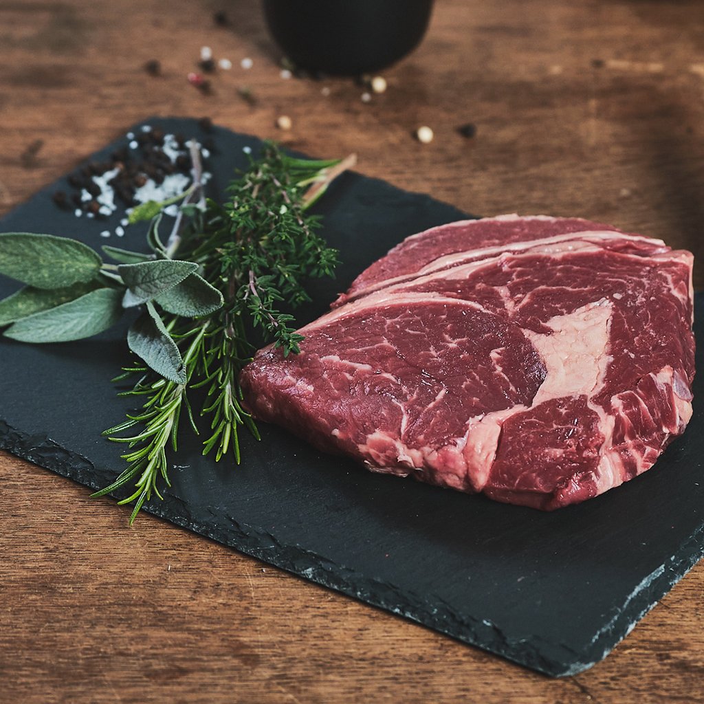 Rinder-Rib-Eye-Steak stammt aus der hohen Rippe. Der Name stammt vom charakteristisch augenförmigen Querschnitt des Muskelstrangs (engl. Eye). Rib-Eye-Steak ist saftig, zart und geschmacksintensiv: 2-3 min scharf anbraten, anschließend für ca. 10 min im vorgeheizten Backofen (130 Grad) ruhen lassen.